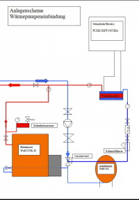 Unten sieht man das Ergebnis meiner Planung, ein bivalents Heizsystem in eine Bestandsanlage, die aus den 60er Jahren ist, einzubinden. Lange war die Überlegung, den bestehnden Heizkörperbestand aus Gussradiatoren durch neue Konvektoren zu ersetzen. Aber selbst die schönsten und neusten Konvektoren bringen ihre Leistung erst jenseits der 50°C Vorlauftemperatur, da dann erst für die Erwärmung nötige Konvektion beginnt. Meine alten Gussradiatoren gestalten überwiegend mit Strahlungswärme die Wohnräume angenehm warm, welche auch schon bei niedrigeren Vorlauftemperaturen funktionieren. Meistens sind die Bestandsheizkörper auch wesentlich größer dimensioniert worden, da es in früheren Jahrzehnten bezüglich Dämmung, Thermopenfenstern etc. noch nicht so komplexe Vorschriften gab, wie es in der heutigen Zeit üblich ist.